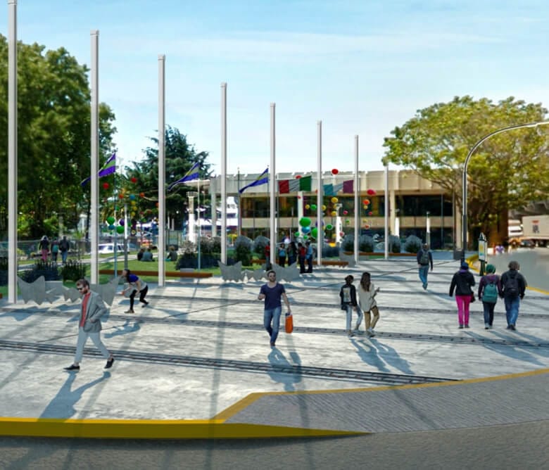 La obra recupera 2 km de espacios lineales, en las plazoletas laterales de la Avenida 9 de Julio. Combina: caminabilidad, equipamiento urbano y paisaje, además de compatibilizar con el Metro Bus 9 de Julio
